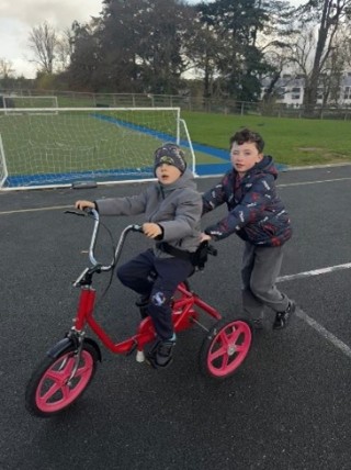 October 2025 - We have had a great few weeks in our class. We have really been enjoying Playball. We have been learning all about autumn. We looked at The Colour Monster story and Room on the Broom. This week we had our Halloween party, which was great fun. We also received a new bike in the class, which has been great fun in the yard.